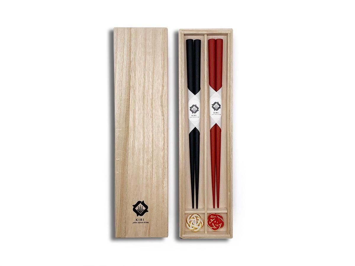 角のある断面は持ちやすく、乾漆仕上げは指先に心地よい質感を与え、食材がすべりにくいのも特徴です。いずれも水引の箸置きが2個付属し、実用性と文化的な意味を兼ね備えたギフトです。