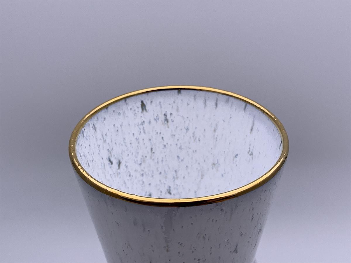 金色の縁飾りが華やかでお祝いの場にも相応しい器です。白地には釉薬によって灰色の斑点が施され、青地も手工芸ならではの味わい深い仕上がりです。お茶を入れたり、果物やお菓子など非常に汎用性の高い素材と色合いです。